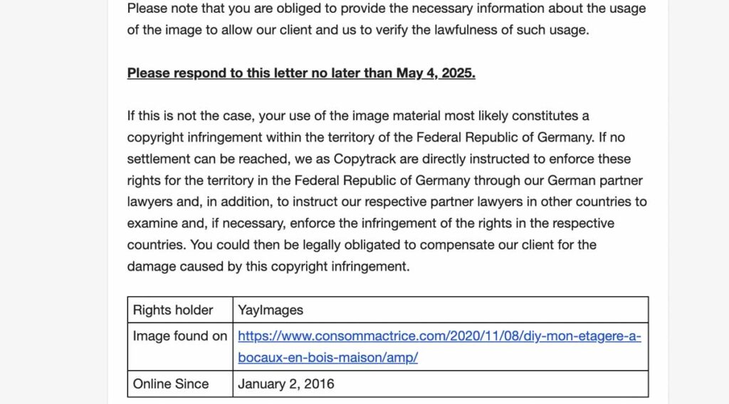 Par contre si un jour, vous receviez un mail d’un vrai cabinet d’avocat qui vous met en demeure avec vos coordonnées, ça vaut peut-être la peine de prendre conseil auprès d’un spécialiste du droit de l’image.